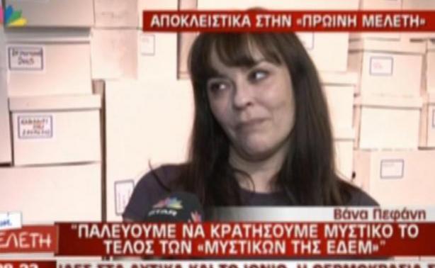 «Μυστικά… τέλος» για τα «Μυστικά της Εδέμ» που μετά από τρεισήμισι χρόνια ρίχνουν αυλαία την Πέμπτη που μας έρχεται.(22.00)... Η τηλεοπτική «Αμαλία» της επιτυχημένης σειράς του Mega και κατά κόσμον Βάνα Πεφάνη, μίλησε στην κάμερα της «Πρωινής Μελέτης» για το τέλος της Εδέμ αποκαλύπτοντας πως θα υπάρχουν ανατροπές και εμφανισιακές εκπλήξεις.Για το τέλος, όμως, ούτε κουβέντα…«Παλεύουμε να κρατήσουμε μυστικό το τέλος των Μυστικών της Εδέμ.Μπορώ όμως να πω κάτι: Για όλους υπάρχει το τέλος που τους αξίζει», είπε χαρακτηριστικά η ηθοποιός.
